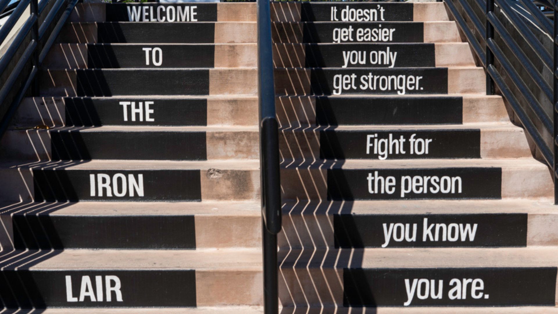 At Iron Lair, a Los Angeles gym, we painted motivational text on outdoor stairwell risers. Members climbing those stairs read the message with every step— building the mindset while building their strength. The stairs became part of the workout philosophy, not just the path to it.