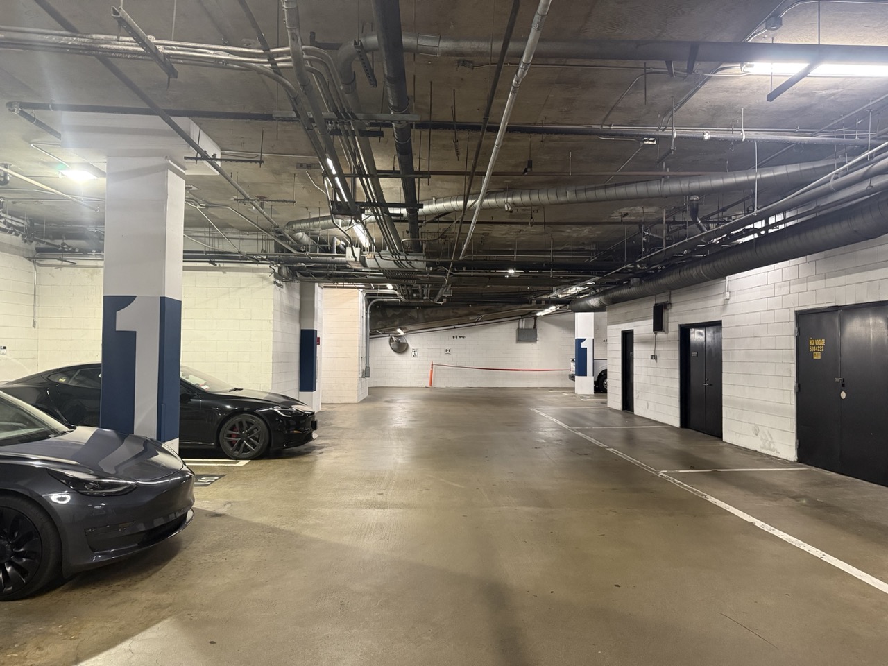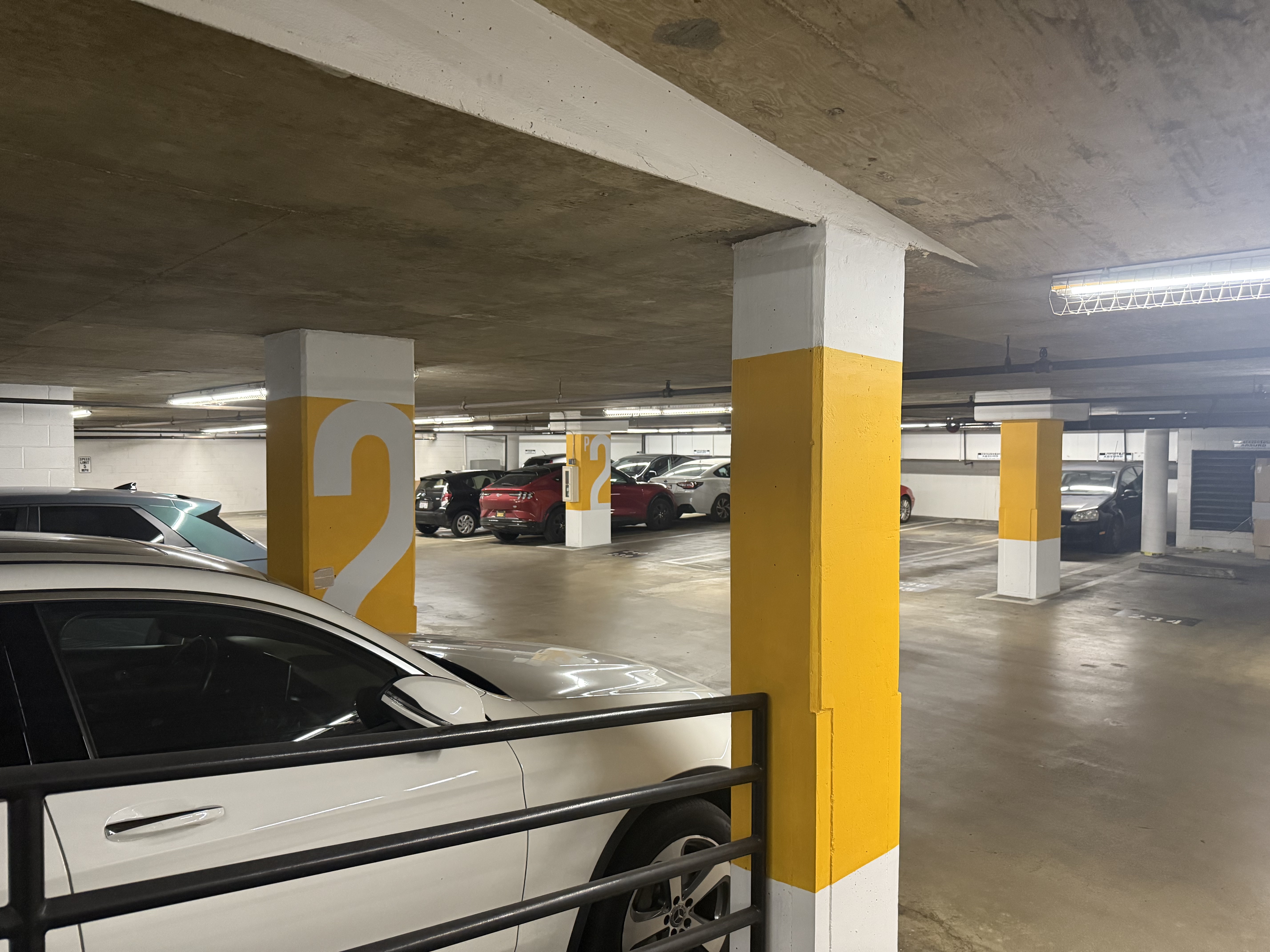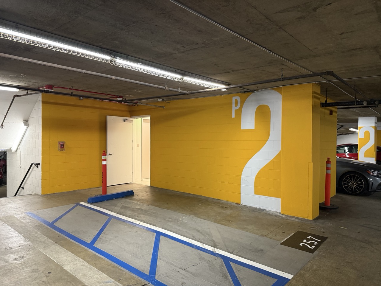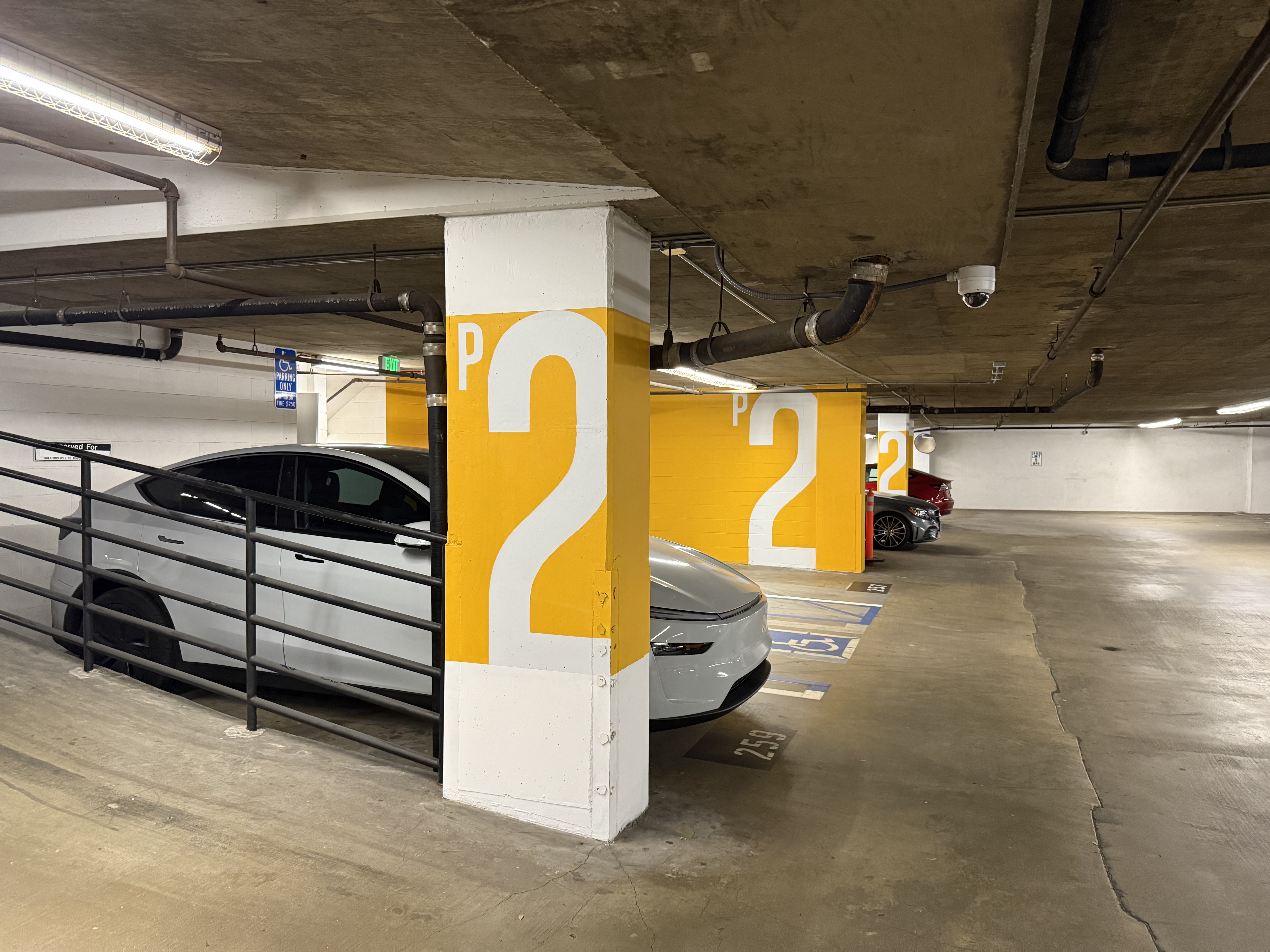 Underground parking garage signage and wayfinding, marking three full floors with branded colors, large-scale lettering, and precise linework.